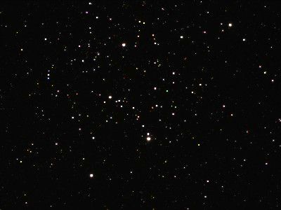 口径10cm望遠鏡の40倍では、微光星がはっきり見え、片側の明るい星の配列が逆「く」の字を描いているのがわかる。