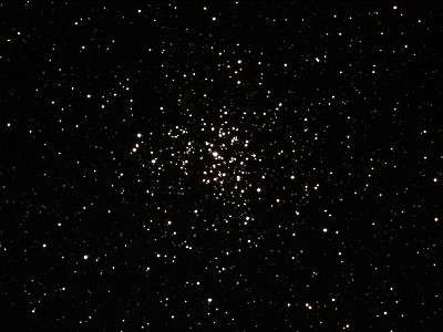M37は口径10cm望遠鏡の低倍率では、星雲状のイメージを背景に微光星が見え、全体の姿はややいびつな三角形に見える。13等級以上の星が170個、16等級以上の星は570個もある大星団だ。