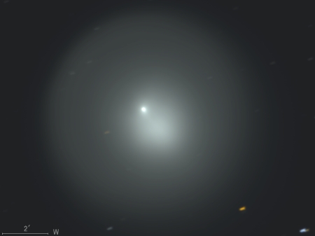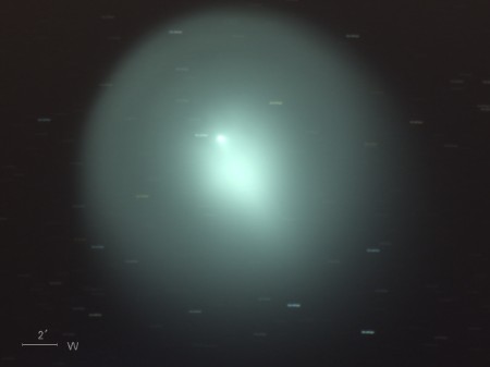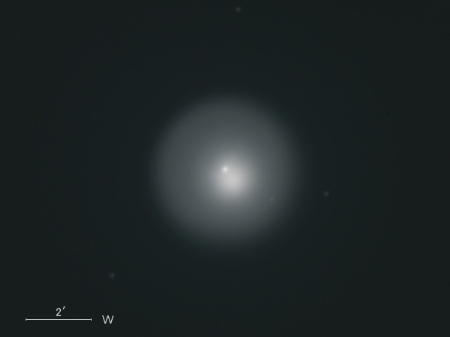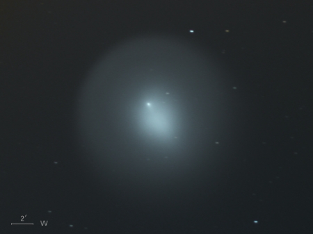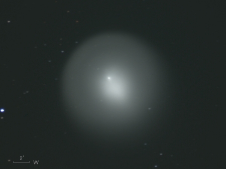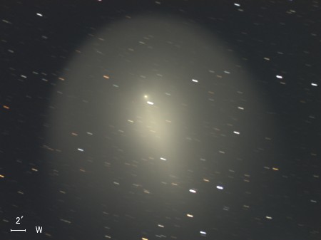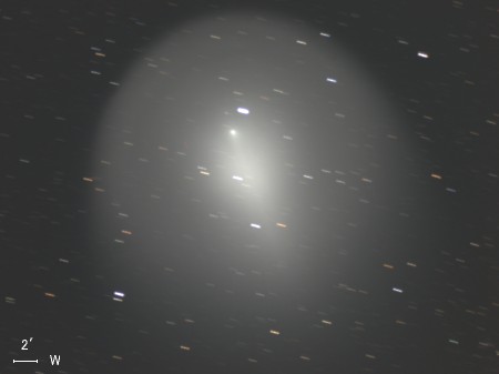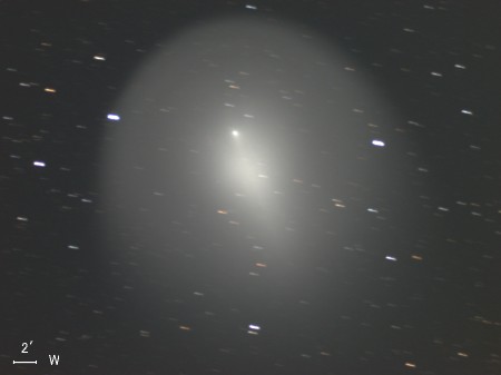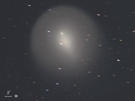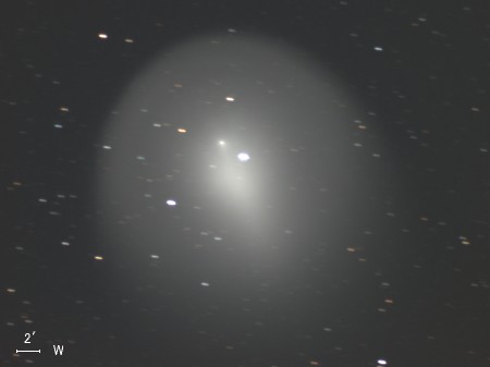 ホームズ彗星(17P)は公転周期が約7年の周期彗星で、今年5月に近日点を通過したばかりだったが、 その後、10月23日に17等前後での観測報告があった。 10月24日 突然の大バーストが起こって午後11時ごろ(日本時間)には肉眼で3.0等級、 25日午前1時半ごろ(同)には2.8等級となっており、さらに増光が続いている。 わずか2日ほどの間に14等級も増光したということです。