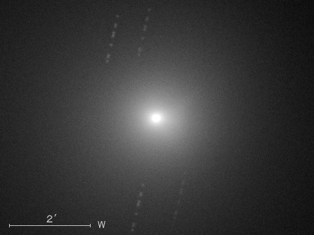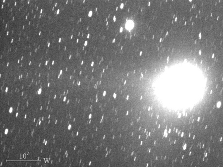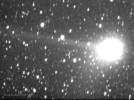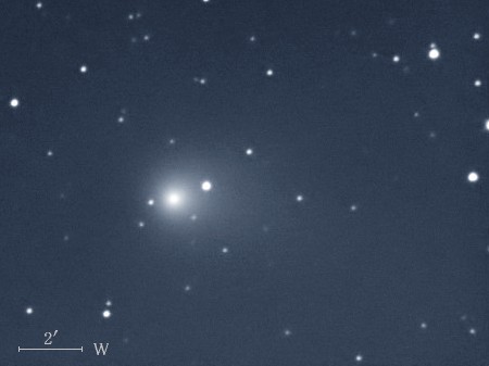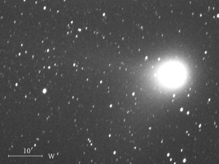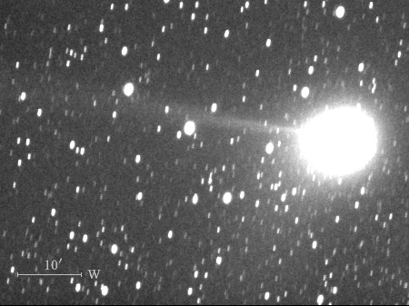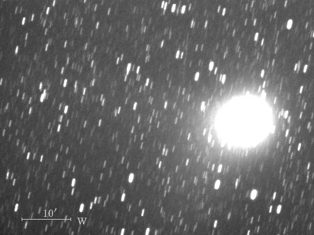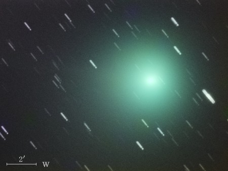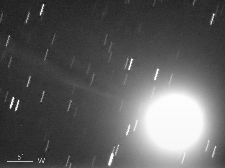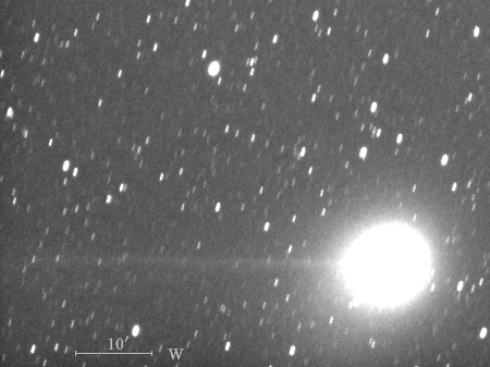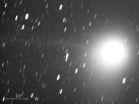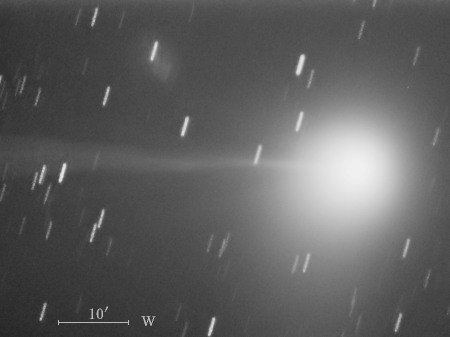 コメント 彗星核から伸びたイオンの尾が約15′(画像の中央)付近から開きはじめていますね。