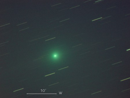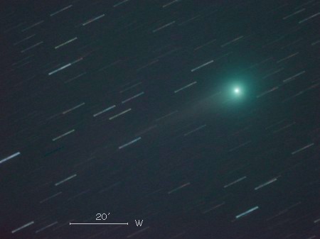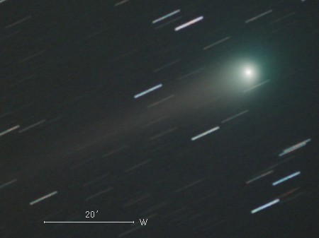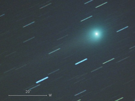 ルーリン彗星(C/2007 N3)は、2007年7月に台湾のルーリン(鹿林)天文台の41cm望遠鏡による観測で発見された彗星です。 太陽系外縁部から来たと推定されていて、軌道周期は数万年以上もあります。 1月11日には太陽に約1.2天文単位(1天文単位は地球から太陽までの距離)まで接近しました。 今後は地球に近づき、それに伴って明るさおよび星空の中を移動する速度も大きくなっていきます。 地球への最接近は2月24日で、距離は0.4天文単位です。