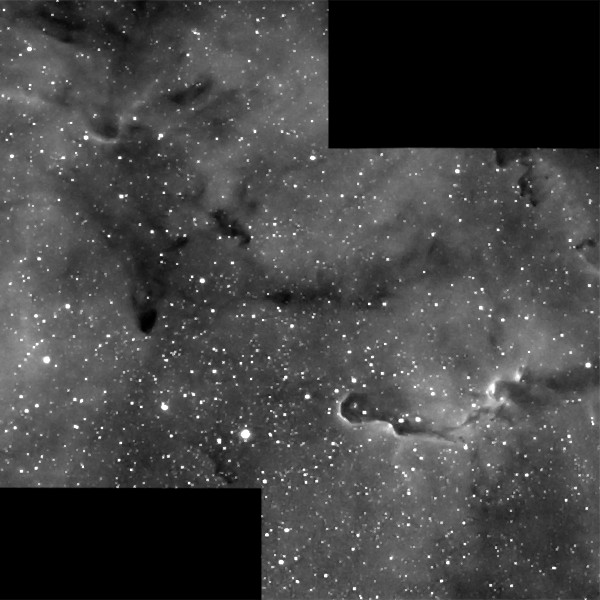 大型の散光星雲のためモザイクにしてみました。 象の鼻のような暗黒星雲が特徴的です。 |