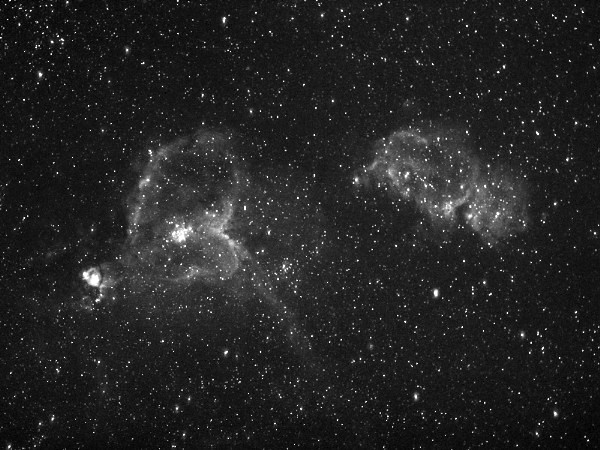 左の星雲 中央の明るい部分が IC1805 散開星団です。 右の星雲内が IC1848 です。 55mm+BJ32Lの画角は35mmフィルムに換算すると300mm相当になります。 |