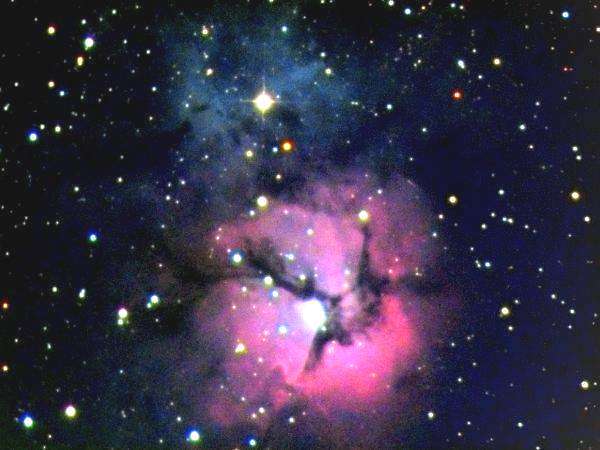 いて座の干潟星雲(M8)のすぐ北にあり、三裂星雲の呼び名で親しまれている散光星雲。明るい散光星雲が暗黒星雲によって3つに引き裂かれたように見えるので、ジョン・ハーシェルによって命名された。星雲中にあるO7型の7等級の高温星の放つ光によって照らし出されているもので、本体は淡いピンク色をしているが、すぐ北に青い色をした散光星雲が隣接していて、20cm以上では見事なコントラストを見せてくれる。写真ではよりいっそう素晴らしい。