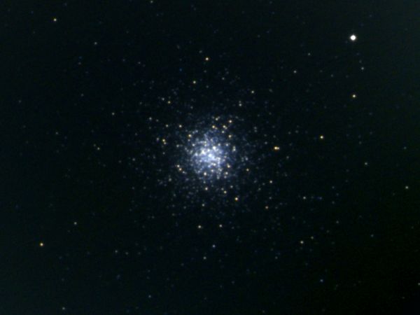口径10cm望遠鏡の低倍率では、丸い星雲状に見える。120倍では周辺が星に分解されて、立体的な丸いボール状に見え、球状星団の美しさを楽しむことができる。