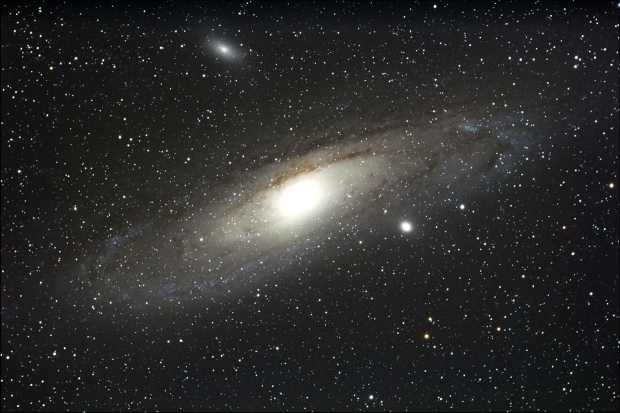 アンドロメダ大銀河は、日本から見える系外銀河としては最大のもので、天文ファンのみならず広く一般に知られている有名な天体だ。満月を横に5つ並べたほどの大きさと、肉眼でもはっきり見える明るさを持つ。すぐ近くにM31の伴銀河であるM32とM110があり、どちらも双眼鏡でよく見える。
