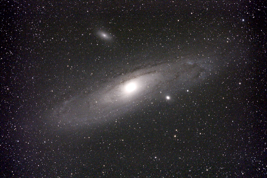 アンドロメダ座β星からカシオペヤ座に向かって、μ星、ν星と辿った先にぼうっと広がる淡い光芒がM31で、肉眼でもはっきりわかる。肉眼でも細長くのびた姿が見え、大きな銀河であることがわかる。