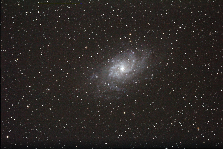 さんかく座は小さいが、形が特徴的なので意外に見つけやすい星座だ。この三角形の頂点のα星と、アンドロメダ座β星を結んだ線上で、ややα星よりの位置にある。ちょうどアンドロメダ座β星をはさんでM31と対称の位置にあるので、それで見当をつけることもできる。