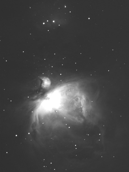 口径10cm望遠鏡の40倍では、星雲の光の中に、4重星トラペジウムがまたたいているようすを観察できる。100倍以上にして中心部をクローズアップすると、光の濃淡が迫力を持って迫り、また違った美しさを味わえる。