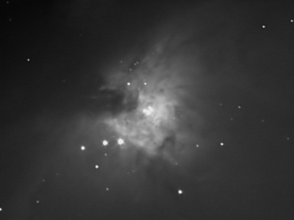 口径10cm望遠鏡の40倍では、星雲の光の中に、4重星トラペジウムがまたたいているようすを観察できる。100倍以上にして中心部をクローズアップすると、光の濃淡が迫力を持って迫り、また違った美しさを味わえる。
