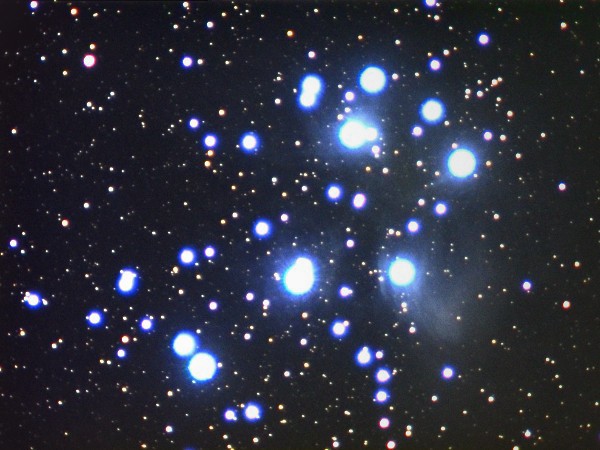 清少納言が枕草子の中で「星はすばる…」と詠んだことで有名な、おうし座の散開星団。ふつうの視力の人で6〜7個の星が見え、目のよい人なら10個以上観察できるといわれている。双眼鏡ではこれが60〜70個、大口径双眼鏡では、約140個もの恒星の集まりであることがわかる。青白い高温の星の集まりで、約5000万年というひじょうに若い星団である。