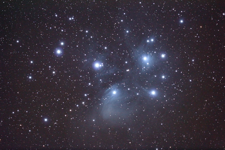 清少納言が枕草子の中で「星はすばる…」と詠んだことで有名な、おうし座の散開星団。ふつうの視力の人で6〜7個の星が見え、目のよい人なら10個以上観察できるといわれている。双眼鏡ではこれが60〜70個、大口径双眼鏡では、約140個もの恒星の集まりであることがわかる。青白い高温の星の集まりで、約5000万年というひじょうに若い星団である。