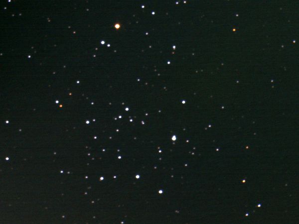 口径10cm望遠鏡の60倍では、約20個ほどの星に分解でき、やや明るい星が1列に並んだような星団全体のようすをよく観察できる。