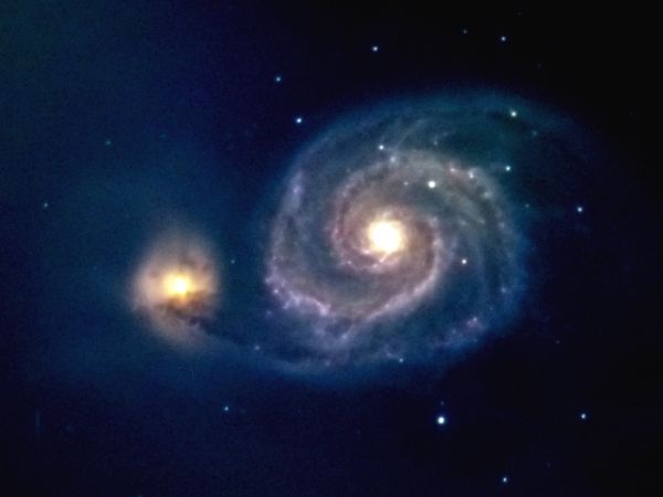 北斗七星の柄の近くにある美しい銀河。大小2つの銀河がつながっているので「子持ち星雲」という名がつけられている。写真では、M51のきれいな渦巻きの1本の腕の先に、NGC5195と名づけられた小型の銀河がぶら下がっている姿が、よくわかる。1994年4月2日に超新星が発見された。