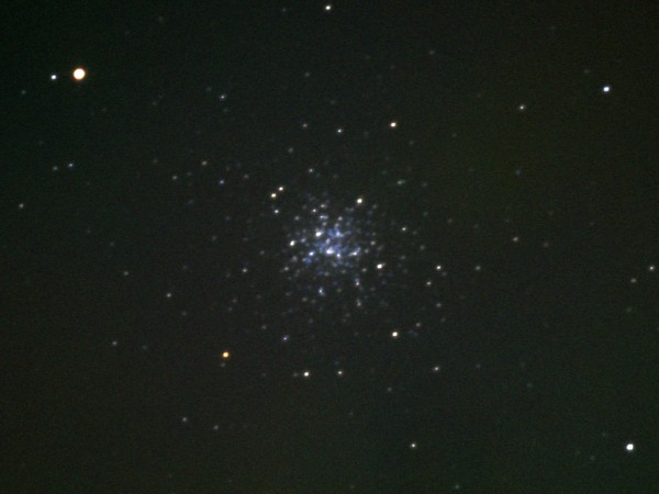 口径10cm望遠鏡の低倍率では、丸い星雲状に見え、120倍で周辺部の微光星が見えて球状星団らしく見える。