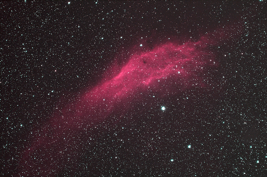 ペルセウス座の散光背雲。アメリカのカリフォルニア州の形に似ているので、カリフォルニア星雲という愛称がある。 淡いので、残念ながら双眼鏡や望遠鏡では見ることがむずかしいが、写真で撮影するとカリフォルニア州のような姿が浮かび上がる。 |