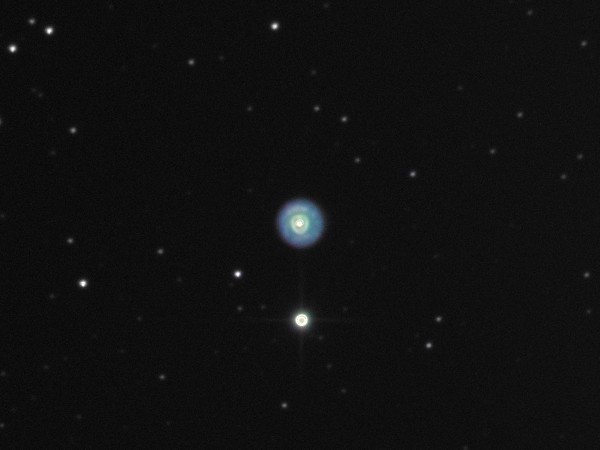 上の天体がエスキモー星雲です。 下は恒星ですが画像処理のしすぎで惑星状星雲に見えてしまいました(T T) 防寒フードをしたエスキモー君に見えるでしょうか? 真中の中心星がエスキモー君の鼻です。