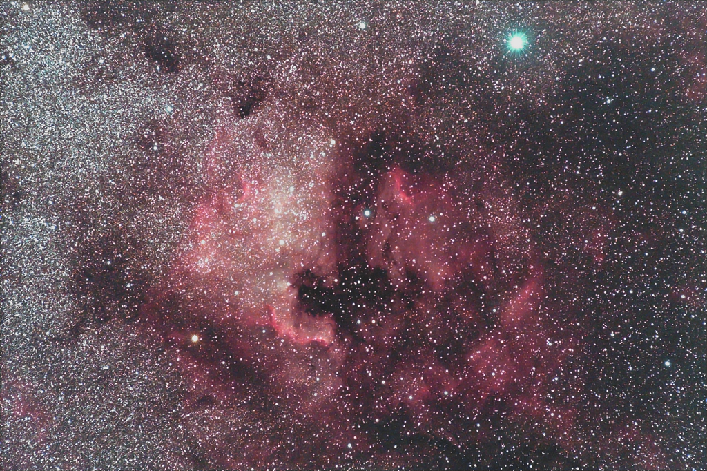 左の北アメリカ大陸にそっくりに見えるのが NGC7000 北アメリカ星雲です。 右の散光星雲は IC5067で ペリカンに見えるところから ペリカン星雲のニックネームが。 |