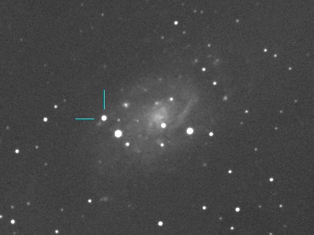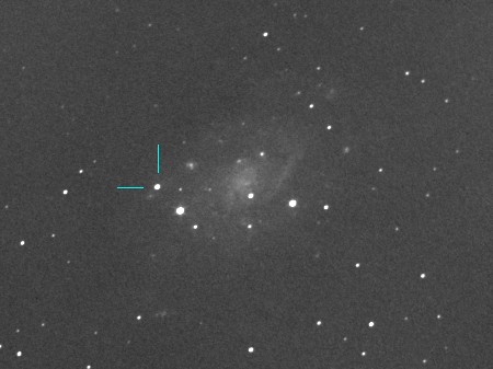 超新星の位置は NGC 2403の中心から、東に160秒角、北10秒角にあります。
