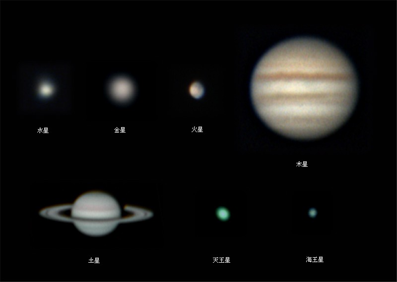 2008.04.30 地球から見た惑星の視直径をそろえて組写真にしてみました。 金星は昼間の撮影です。