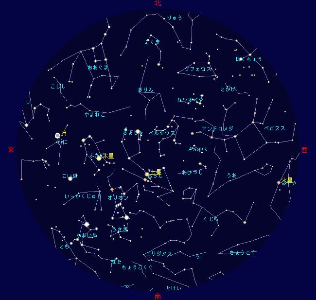 1月になると西空に秋の星座、東空に冬の星座たちです。 冬の星座には一等星が多くその中に木星、土星も加わりにぎやかになっています。 その木星、土星に月が接近し惑星食が見られます。