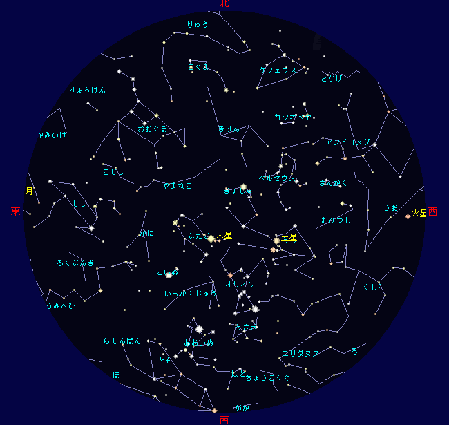冬の星座には1等星が多くその中に木星、土星も加わりにぎやかになっています。 今月は大きな天文現象はありませんね。 透明度の良いこの時期に冬の星座の名前と1等星の名前を覚えてみてはいかがでしょうか。