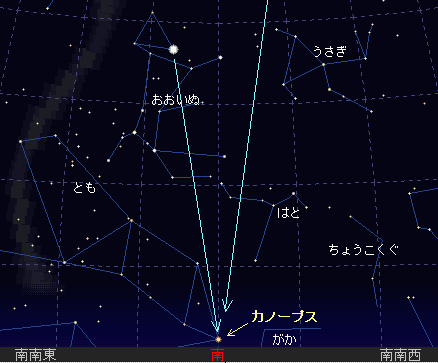 2月20日 カノープスが南中するのが 夜 8時05分です。 20日前後の8時ごろ南天の開けた所で地平線まで雲が無ければ見られるチャンスです。