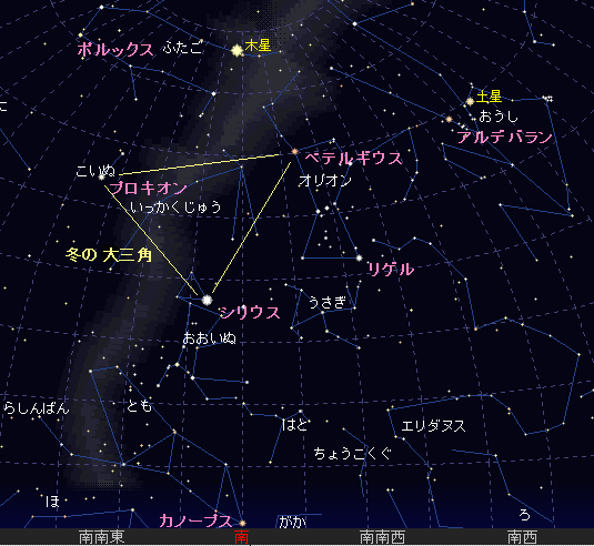 冬の夜空にめだつ3つの星座の明るい星を結ぶと大きな三角形ができます。 これを「冬の大三角形」と呼び。