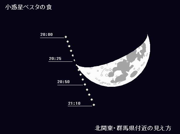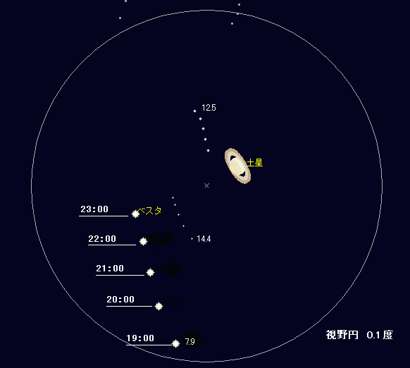 土星食に続き 7.9等星の小惑星ベスタの食が見られます。 この食は眼視では無理で双眼鏡や望遠鏡でないと見られません。