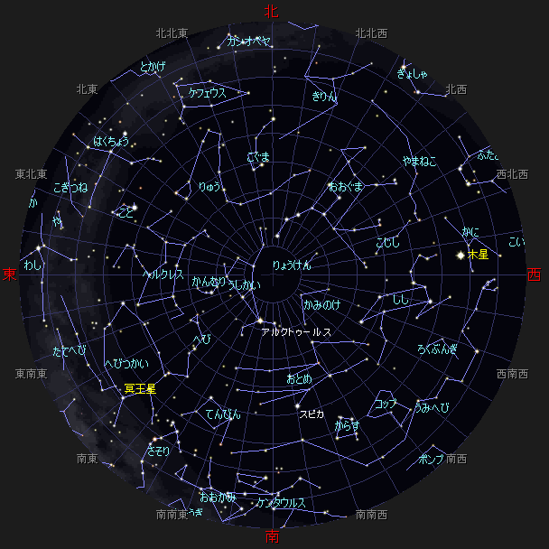 ☆ 星図の作成は アストロアーツ マルチメディア天文シュミレーション ステラナビゲータ を使用しております。 ☆ 詳しい星空ガイドは アストロアーツHP、月刊星ナビ、月刊天文ガイド 等を見てください。 ☆ 星空ガイドは、月刊星ナビ、月刊天文ガイド、天文年鑑 を参考に作成しました。 |