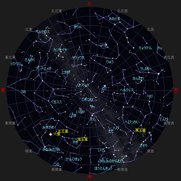 ☆ 星図の作成は アストロアーツ マルチメディア天文シュミレーション ステラナビゲータ を使用しております。 ☆ 詳しい星空ガイドは アストロアーツHP、月刊星ナビ、月刊天文ガイド 等を見てください。 ☆ 星空ガイドは、月刊星ナビ、月刊天文ガイド、天文年鑑 を参考に作成しました。 |