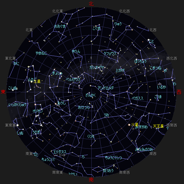 ☆ 星図の作成は アストロアーツ マルチメディア天文シュミレーション ステラナビゲータ を使用しております。 ☆ 詳しい星空ガイドは アストロアーツHP、月刊星ナビ、月刊天文ガイド 等を見てください。 ☆ 星空ガイドは、月刊星ナビ、月刊天文ガイド、天文年鑑 を参考に作成しました。 |