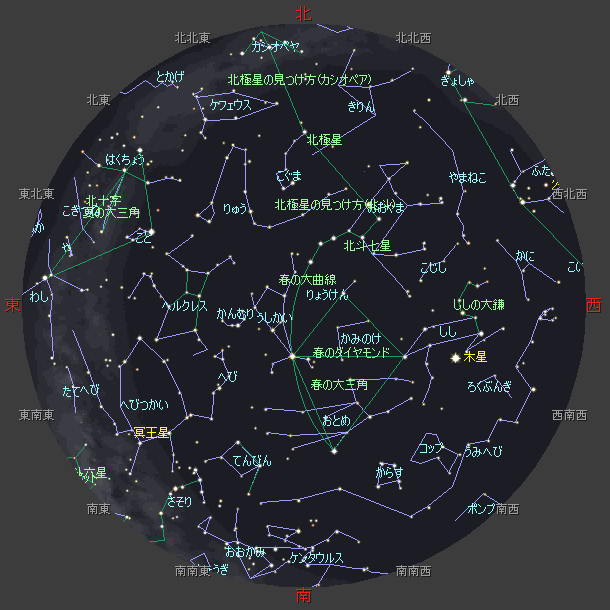 ☆ 星図の作成は アストロアーツ マルチメディア天文シュミレーション ステラナビゲータ を使用しております。 ☆ 詳しい星空ガイドは アストロアーツHP、月刊星ナビ、月刊天文ガイド 等を見てください。 ☆ 星空ガイドは、月刊星ナビ、月刊天文ガイド、天文年鑑 を参考に作成しました。 |