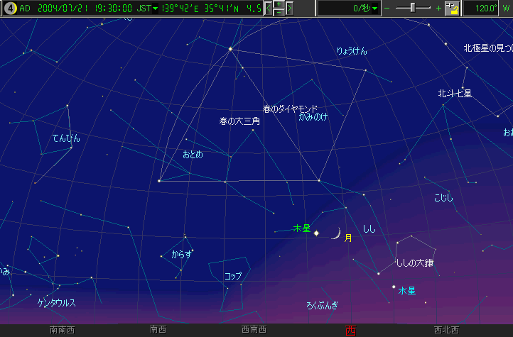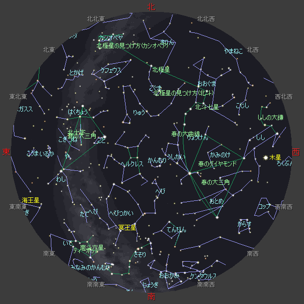 ☆ 星図の作成は アストロアーツ マルチメディア天文シュミレーション ステラナビゲータ を使用しております。 ☆ 詳しい星空ガイドは アストロアーツHP、月刊星ナビ、月刊天文ガイド 等を見てください。 ☆ 星空ガイドは、月刊星ナビ、月刊天文ガイド、天文年鑑 を参考に作成しました。 |
