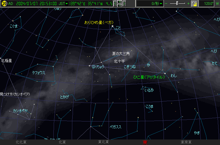夜 9時ごろの七夕の星、おりひめ星(こと座のベガ)、ひこ星(わし座のアリタイル)は東の空に輝いています。