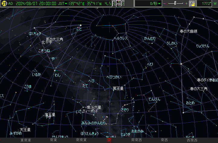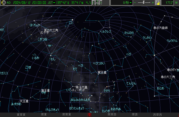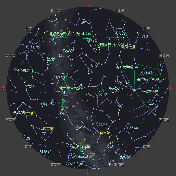 ☆ 星図の作成は アストロアーツ マルチメディア天文シュミレーション ステラナビゲータ を使用しております。 ☆ 詳しい星空ガイドは アストロアーツHP、月刊星ナビ、月刊天文ガイド 等を見てください。 ☆ 星空ガイドは、月刊星ナビ、月刊天文ガイド、天文年鑑 を参考に作成しました。 |
