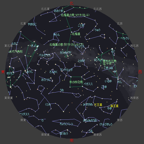 ☆ 星図の作成は アストロアーツ マルチメディア天文シュミレーション ステラナビゲータ を使用しております。 ☆ 詳しい星空ガイドは アストロアーツHP、月刊星ナビ、月刊天文ガイド 等を見てください。 ☆ 星空ガイドは、月刊星ナビ、月刊天文ガイド、天文年鑑 を参考に作成しました。 |