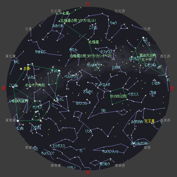 ☆ 星図の作成は アストロアーツ マルチメディア天文シュミレーション ステラナビゲータ を使用しております。 ☆ 詳しい星空ガイドは アストロアーツHP、月刊星ナビ、月刊天文ガイド 等を見てください。 ☆ 星空ガイドは、月刊星ナビ、月刊天文ガイド、天文年鑑 を参考に作成しました。 |
