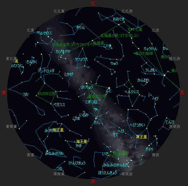 ☆ 星図の作成は アストロアーツ マルチメディア天文シュミレーション ステラナビゲータ を使用しております。 ☆ 詳しい星空ガイドは アストロアーツHP、月刊星ナビ、月刊天文ガイド 等を見てください。 ☆ 星空ガイドは、月刊星ナビ、月刊天文ガイド、天文年鑑 を参考に作成しました。 |