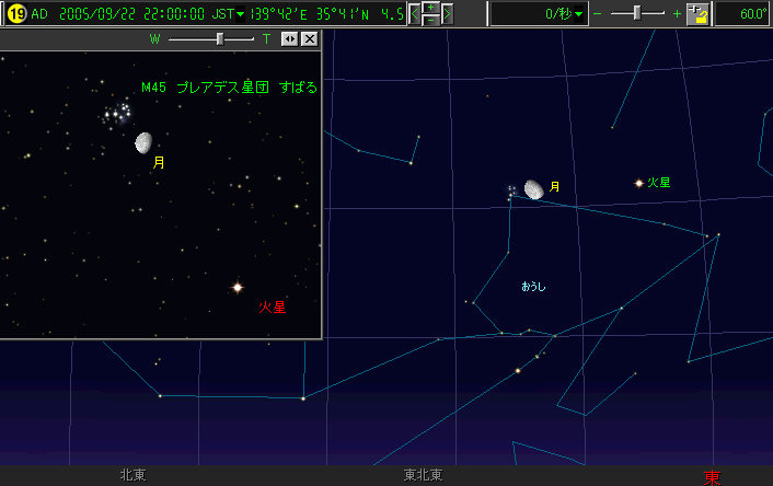 22日(木) 月とM45(プレアデス星団)(すばる)と火星がならぶ