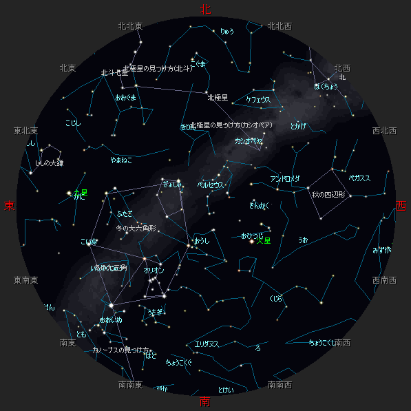 ☆ 星図の作成は アストロアーツ マルチメディア天文シュミレーション ステラナビゲータ を使用しております。 ☆ 詳しい星空ガイドは アストロアーツHP、月刊星ナビ、月刊天文ガイド 等を見てください。 ☆ 星空ガイドは、月刊星ナビ、月刊天文ガイド、天文年鑑 を参考に作成しました。 |