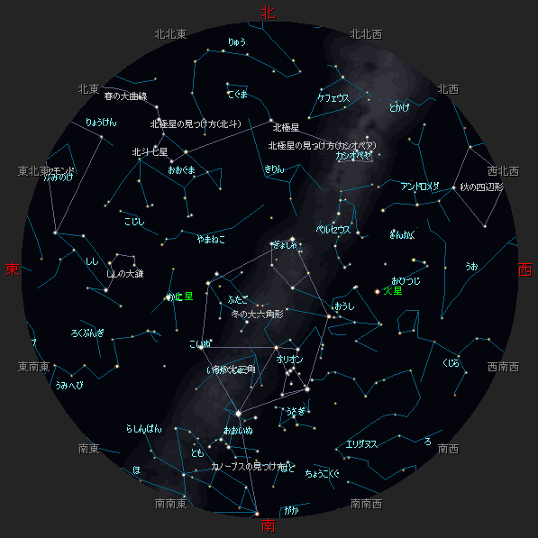 ☆ 星図の作成は アストロアーツ マルチメディア天文シュミレーション ステラナビゲータ を使用しております。 ☆ 詳しい星空ガイドは アストロアーツHP、月刊星ナビ、月刊天文ガイド 等を見てください。 ☆ 星空ガイドは、月刊星ナビ、月刊天文ガイド、天文年鑑 を参考に作成しました。 |