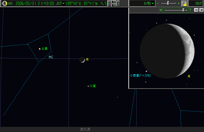 四大小惑星のベスタが5月31日の夕方、細い月に隠されるところが全国で見られる。