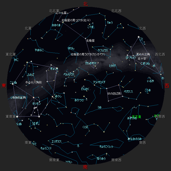 ☆ 星図の作成は アストロアーツ マルチメディア天文シュミレーション ステラナビゲータ を使用しております。 ☆ 詳しい星空ガイドは アストロアーツHP、月刊星ナビ、月刊天文ガイド 等を見てください。 ☆ 星空ガイドは、月刊星ナビ、月刊天文ガイド、天文年鑑 を参考に作成しました。 |