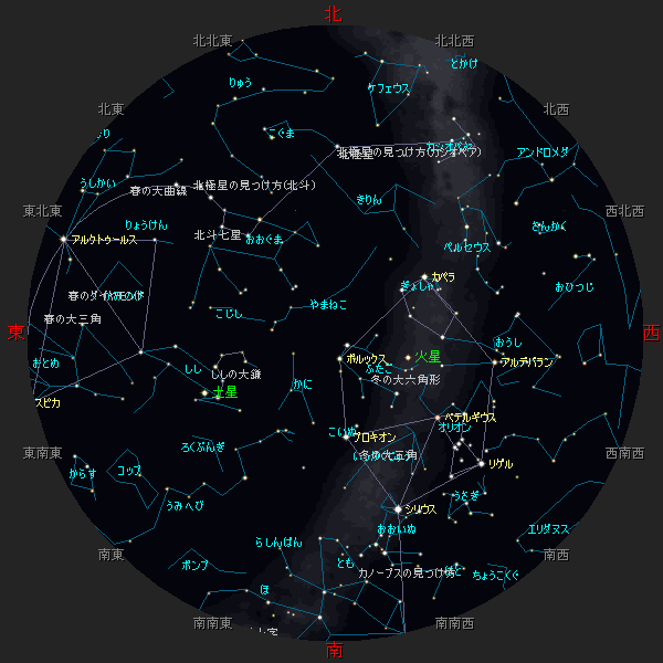 ☆ 星図の作成は アストロアーツ マルチメディア天文シュミレーション ステラナビゲータ を使用しております。 ☆ 詳しい星空ガイドは アストロアーツHP、月刊星ナビ、月刊天文ガイド 等を見てください。 ☆ 星空ガイドは、月刊星ナビ、月刊天文ガイド、天文年鑑 を参考に作成しました。 |