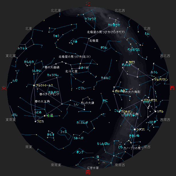 ☆ 星図の作成は アストロアーツ マルチメディア天文シュミレーション ステラナビゲータ を使用しております。 ☆ 詳しい星空ガイドは アストロアーツHP、月刊星ナビ、月刊天文ガイド 等を見てください。 ☆ 星空ガイドは、月刊星ナビ、月刊天文ガイド、天文年鑑 を参考に作成しました。 |