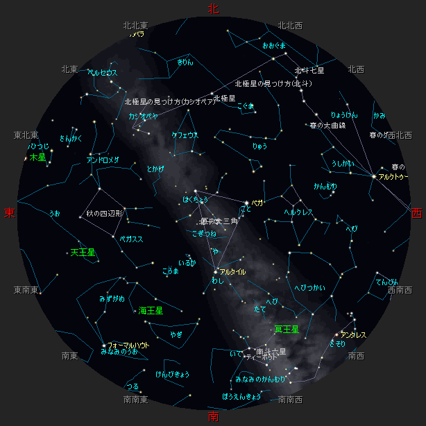 ☆ 星図の作成は アストロアーツ マルチメディア天文シュミレーション ステラナビゲータ を使用しております。 ☆ 詳しい星空ガイドは アストロアーツHP、月刊星ナビ、月刊天文ガイド 等を見てください。 ☆ 星空ガイドは、月刊星ナビ、月刊天文ガイド、天文年鑑 を参考に作成しました。 |