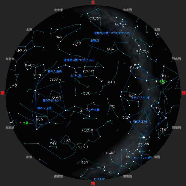 ☆ 星図の作成は アストロアーツ マルチメディア天文シュミレーション ステラナビゲータ を使用しております。 ☆ 詳しい星空ガイドは アストロアーツHP、月刊星ナビ、月刊天文ガイド 等を見てください。 ☆ 星空ガイドは、月刊星ナビ、月刊天文ガイド、天文年鑑 を参考に作成しました。 |