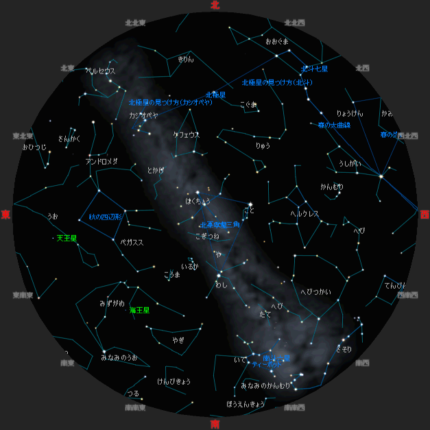 ☆ 星図の作成は アストロアーツ マルチメディア天文シュミレーション ステラナビゲータ を使用しております。 ☆ 詳しい星空ガイドは アストロアーツHP、月刊星ナビ、月刊天文ガイド 等を見てください。 ☆ 星空ガイドは、月刊星ナビ、月刊天文ガイド、天文年鑑 を参考に作成しました。 |