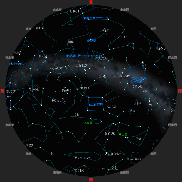 天頂付近の秋の四辺形を目印に星座をさがしてみましょう。
